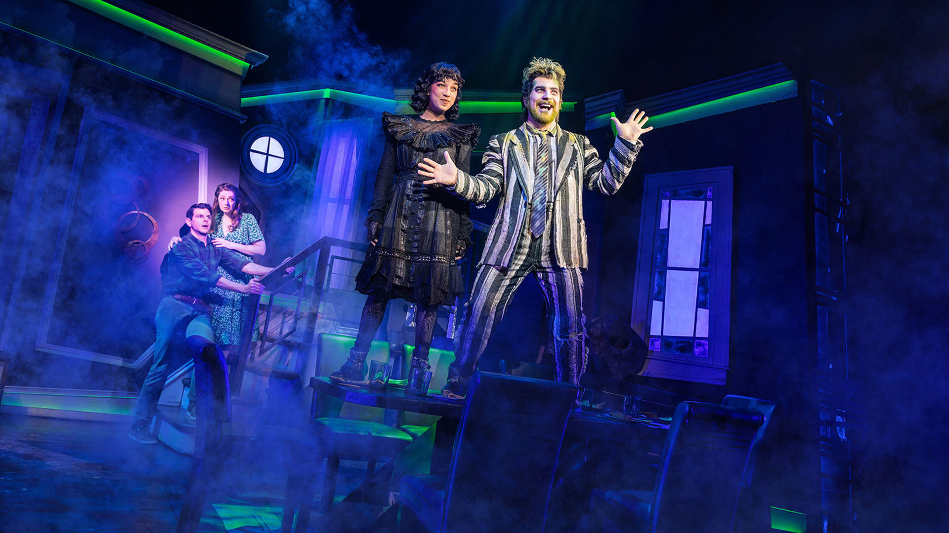 <p>Photo 3: Pictured (L-R): Will Burton (Adam), Megan McGinnis (Barbara), Madison Mosley (Lydia) and Justin Collette (Beetlejuice). Photo by Matthew Murphy, 2024.</p>